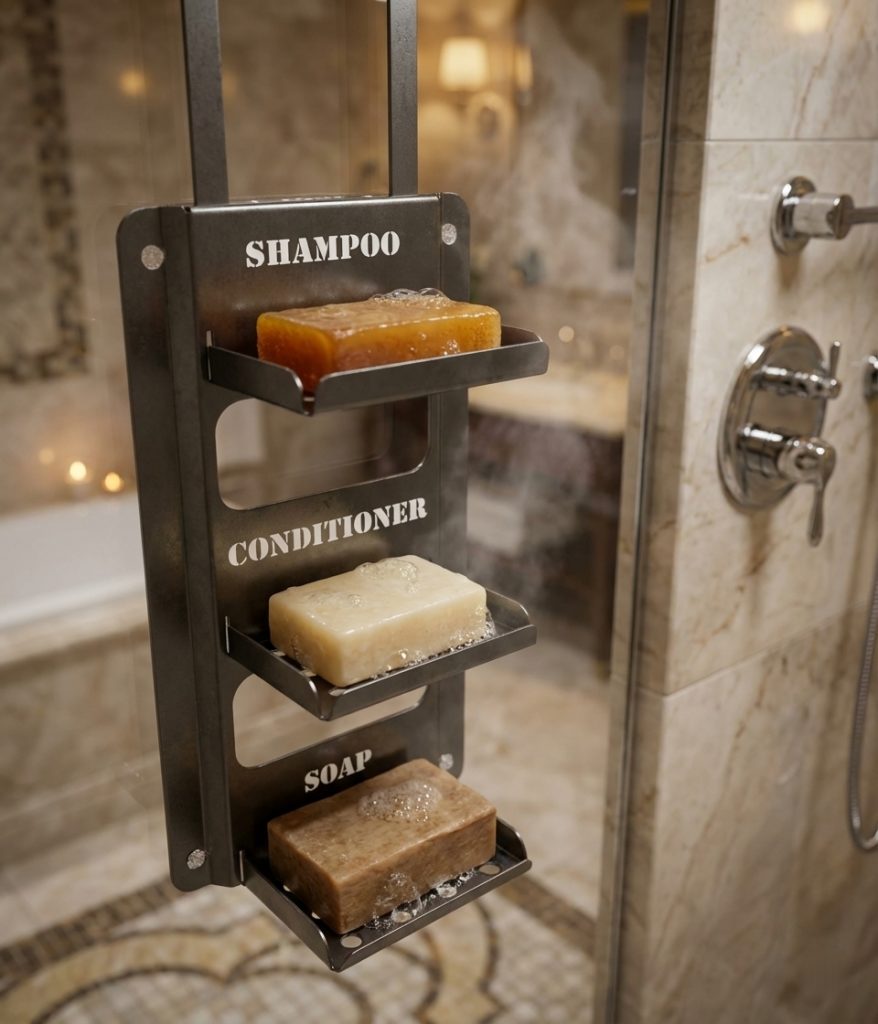 Zur Ablage von Shampoo Seife, Conditioner Seife und Körperseife.